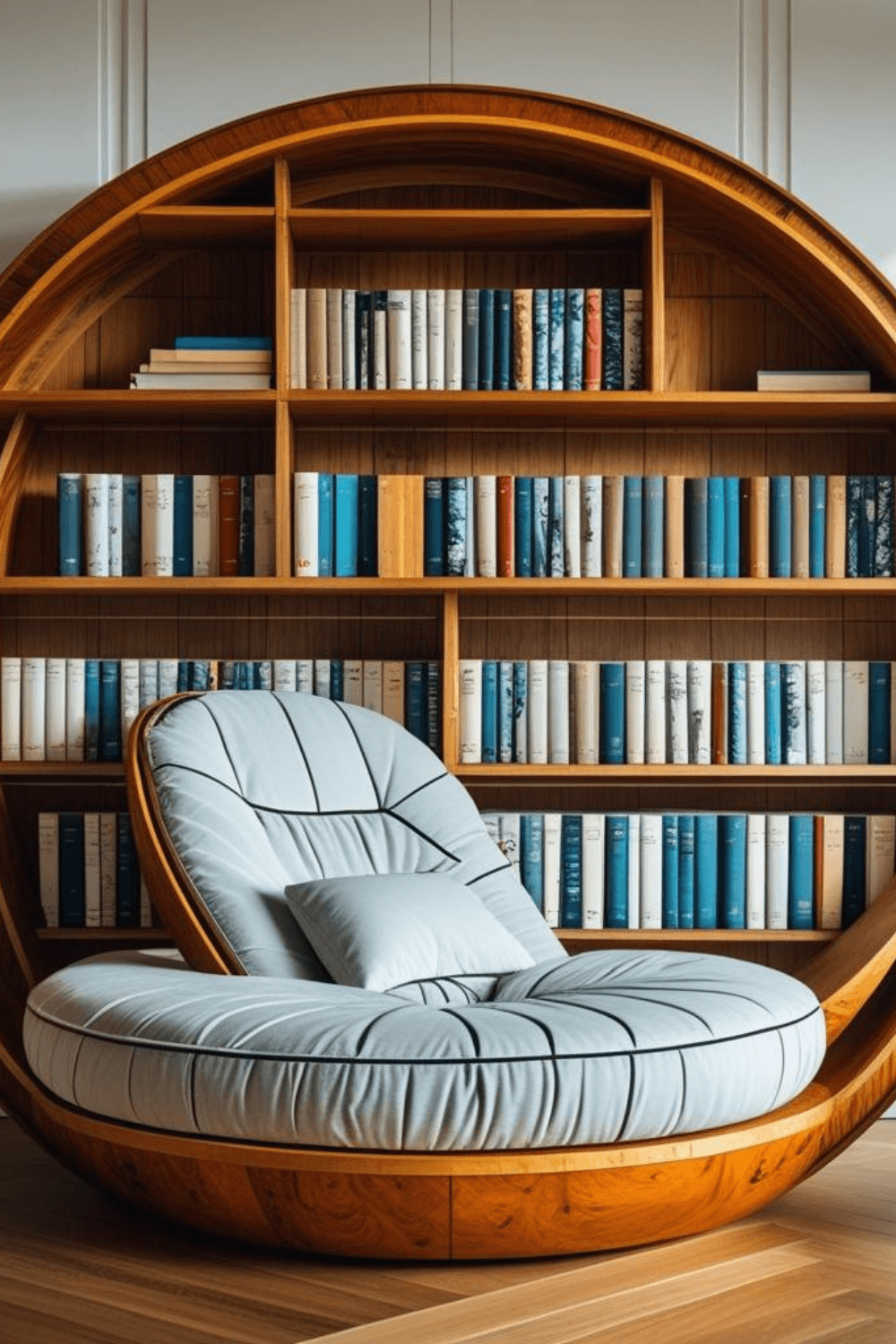 Upgrade your interior with a modern circular bookshelf chair design that blends luxury with practicality. These wooden reading nook furniture ideas not only save space but also create a warm and inviting atmosphere in any living room or study area.