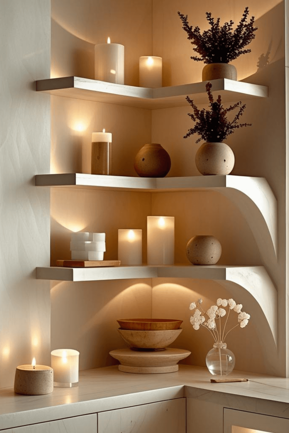 A cozy minimalist corner shelf decor with candles is perfect for creating a warm and relaxing atmosphere in your home. This design focuses on soft lighting, neutral color palettes, and natural textures that bring calmness into any space. By using curved shelves and simple ceramic vases, you can achieve a modern yet timeless aesthetic. Adding scented candles enhances both the visual appeal and the ambiance. This type of decor works especially well in small apartments where space optimization is essential while maintaining elegance and comfort.