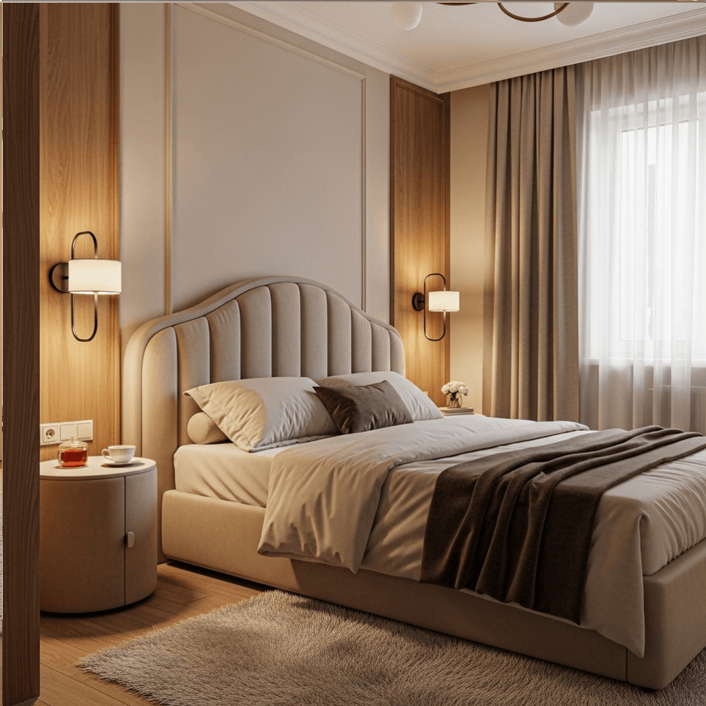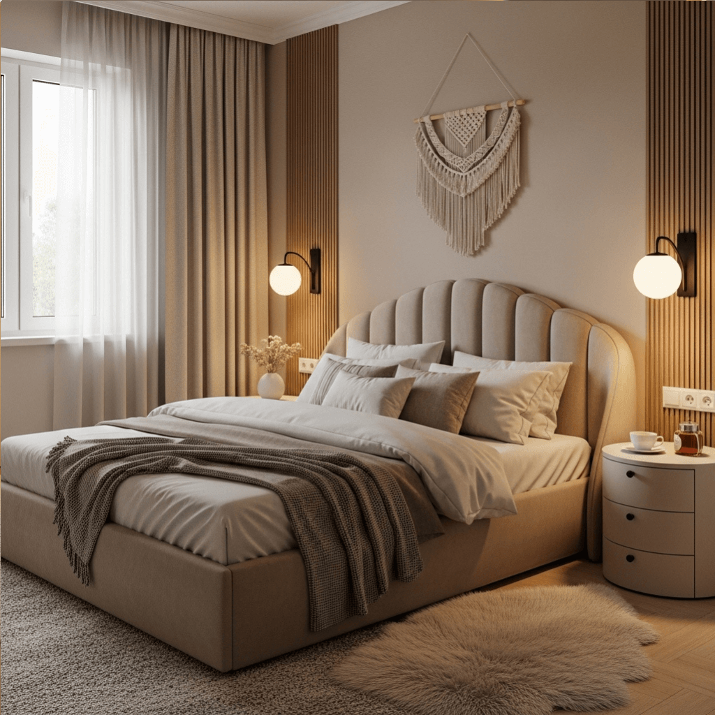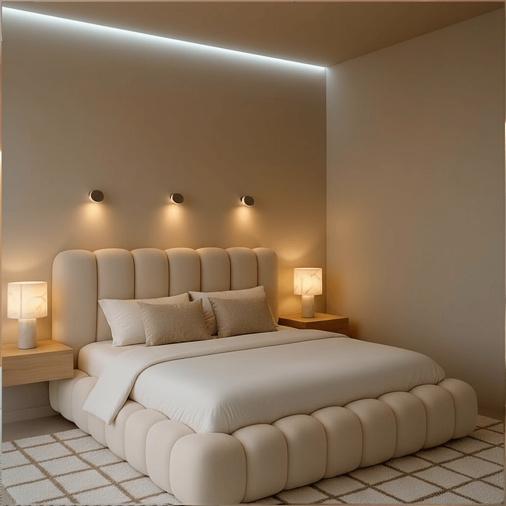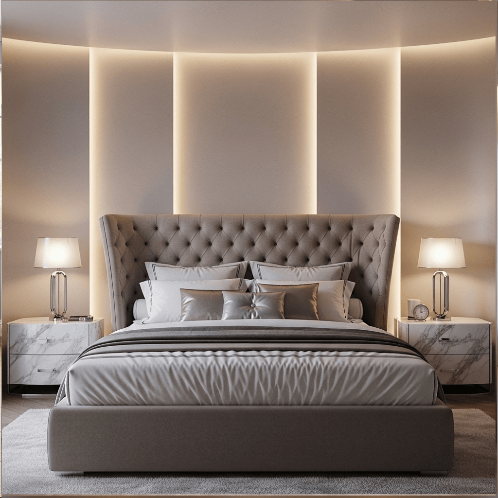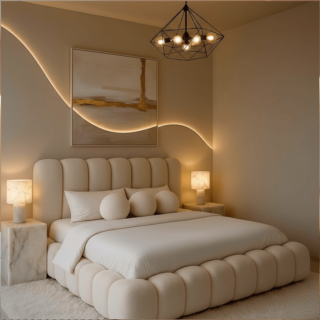 Soft beige upholstered bed design instantly transforms a bedroom into a warm and inviting retreat. This room highlights a plush channel-tufted bed frame with rounded edges that feels both modern and comforting. The creamy palette creates visual harmony, while the curved LED wall lighting adds depth and elegance. Marble side tables and soft bedside lamps enhance the luxury feel without overwhelming the space.