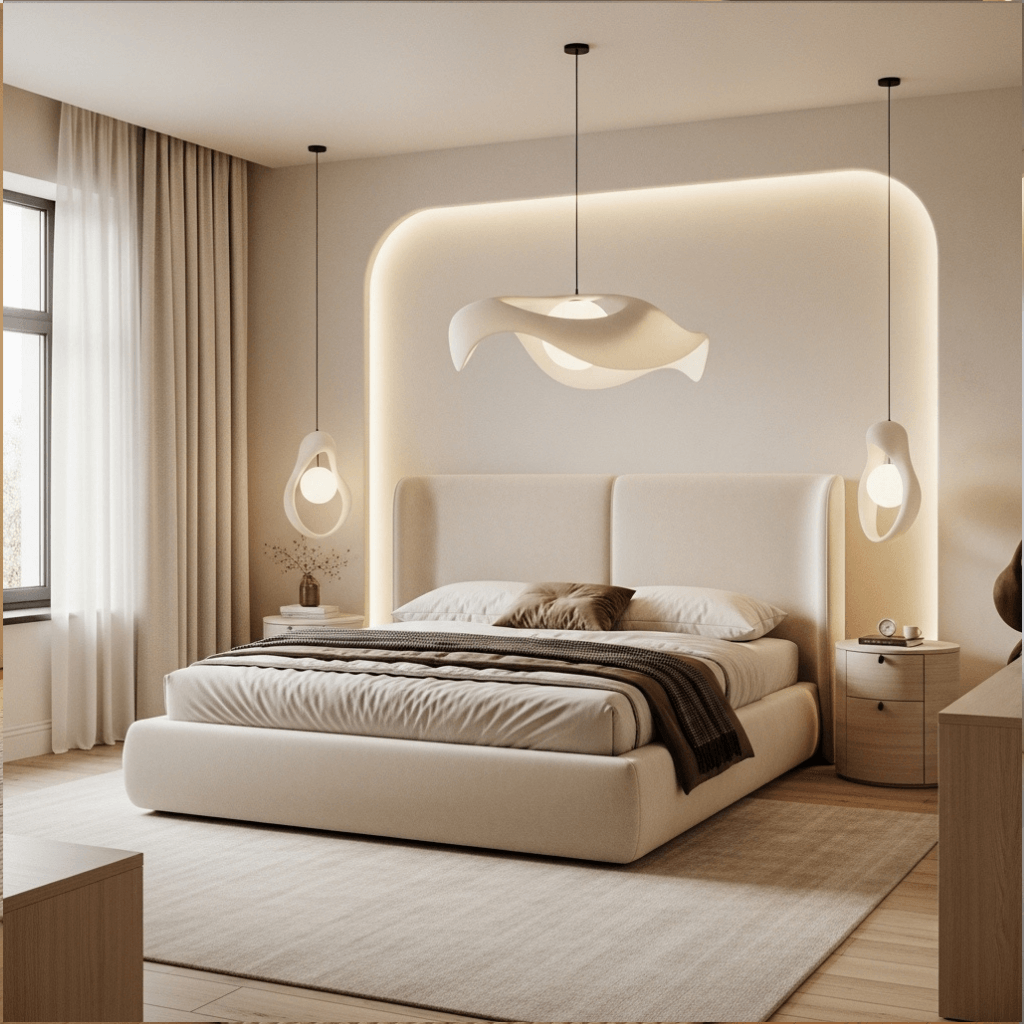 Contemporary cream bedroom styles feel elevated when sculptural lighting is introduced. The layered pendant fixture acts as a focal point while maintaining softness. The curved LED accent line enhances the modern aesthetic.