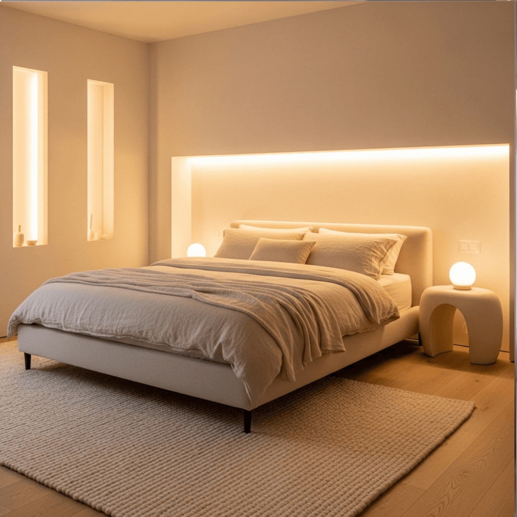 Warm neutral bedroom design focuses on comfort and light layering. This room uses beige tones, soft textiles, and gentle lighting to create a cocoon-like atmosphere. The plush rug under the bed enhances warmth and texture.