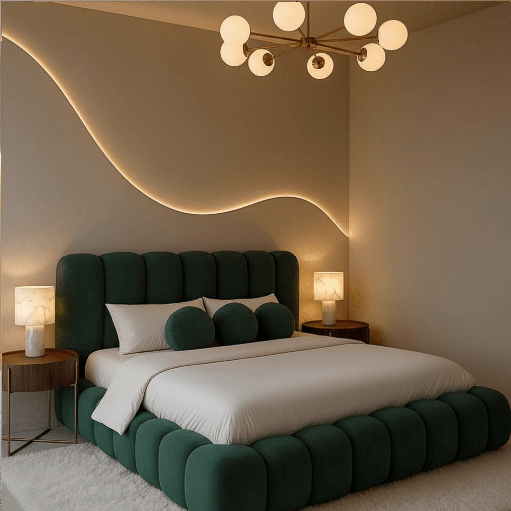 The padded bed frame adds texture and visual softness, preventing the space from feeling flat. Balanced bedside lighting ensures symmetry and comfort. Curved LED bedroom ideas like this are perfect for contemporary interiors seeking subtle drama without clutter.