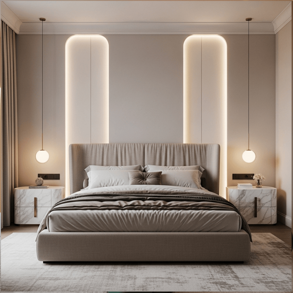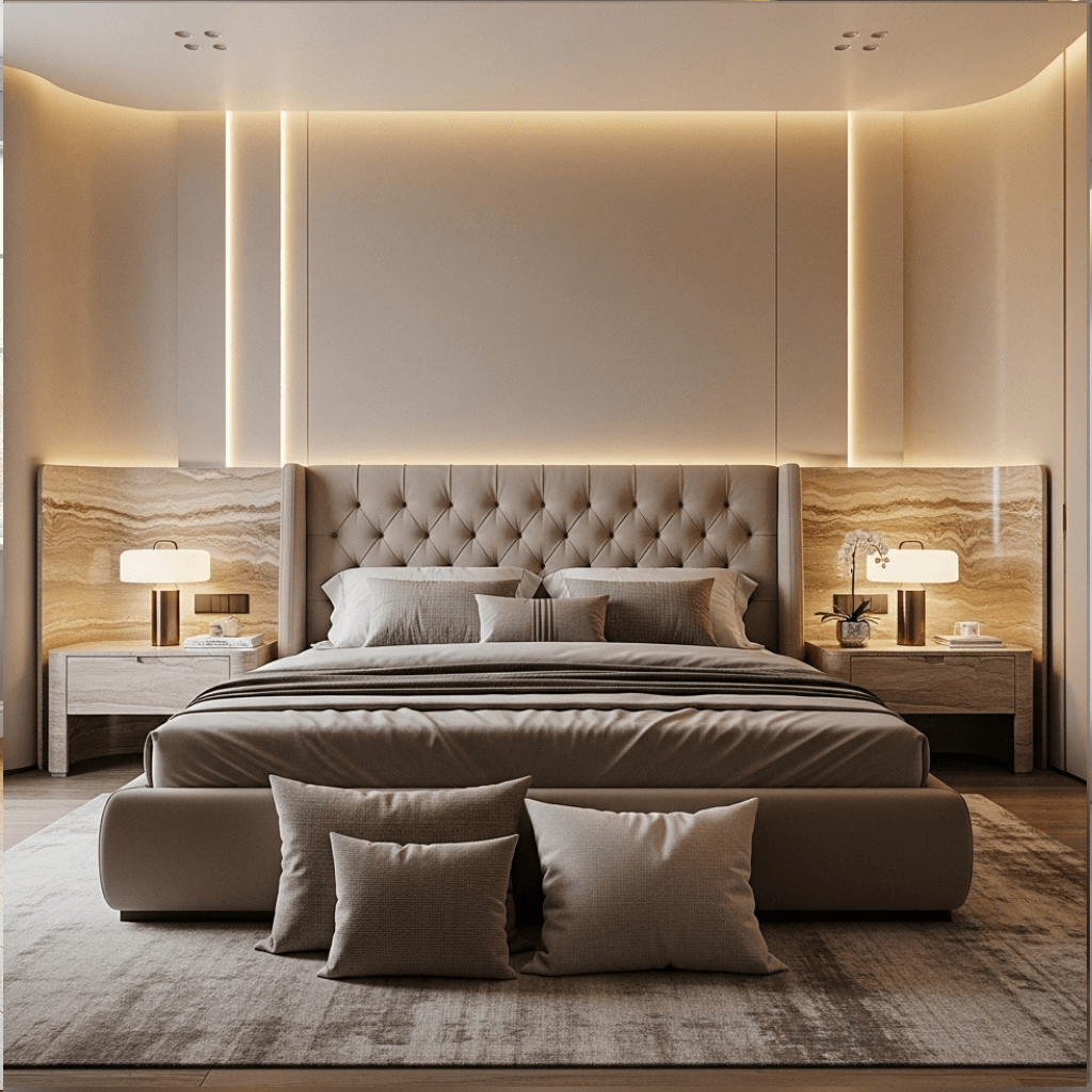The curved LED feature wall adds elegance without heaviness. Beige marble bedroom ideas like this are perfect for upscale interiors.