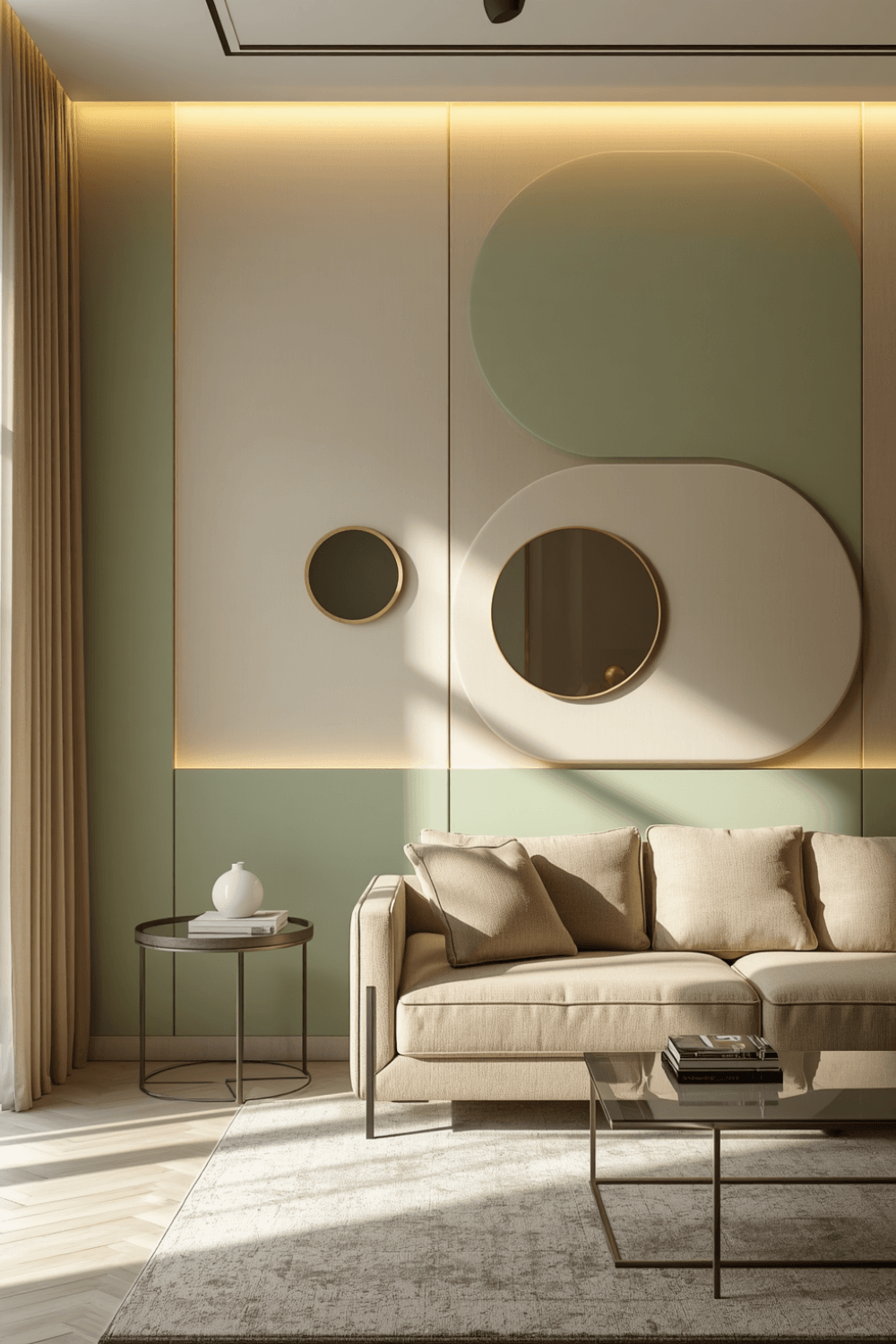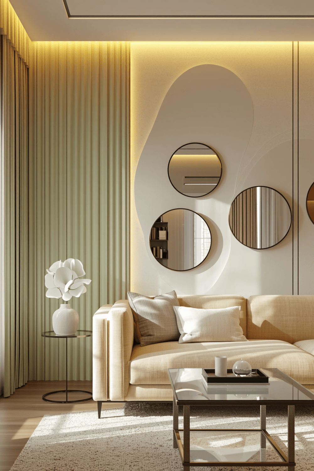 In addition, modern minimalist wall decor is highly popular on Pinterest due to its aesthetic and user-friendly nature. The combination of beige sofas, textured walls, and round mirrors creates a balanced and stylish look. This design works perfectly for both small and large homes, making it versatile and practical. If you want to upgrade your living room interior, this minimalist wall design is a perfect choice for a modern and cozy home environment.