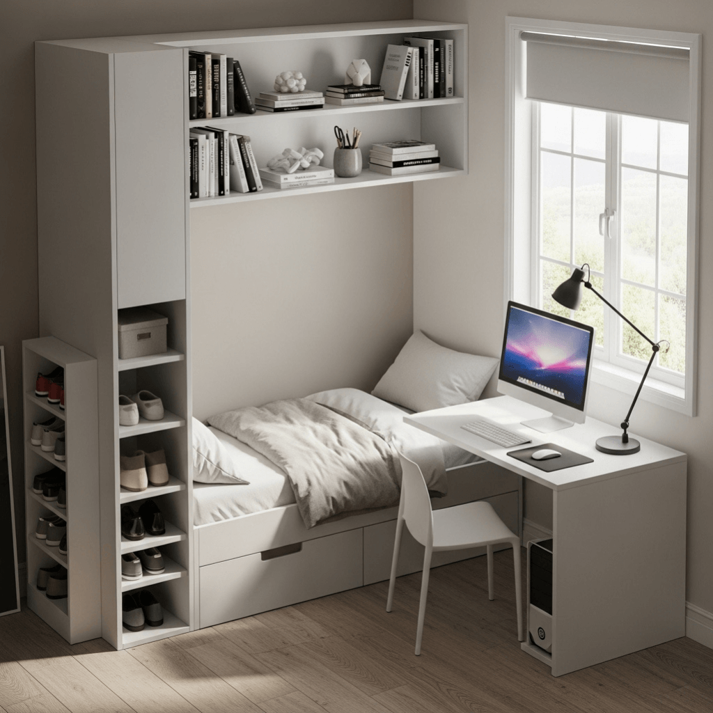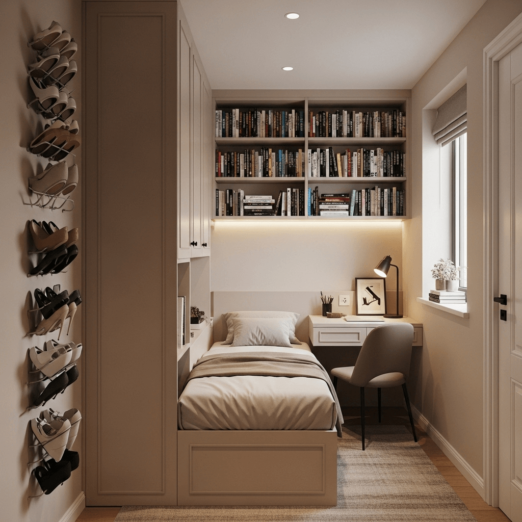 Small Bedroom with Built-In Desk, Overhead Bookshelves, and Wall-Mounted Shoe Storage