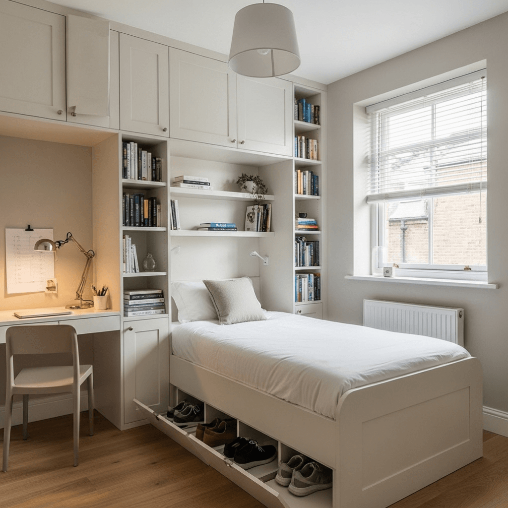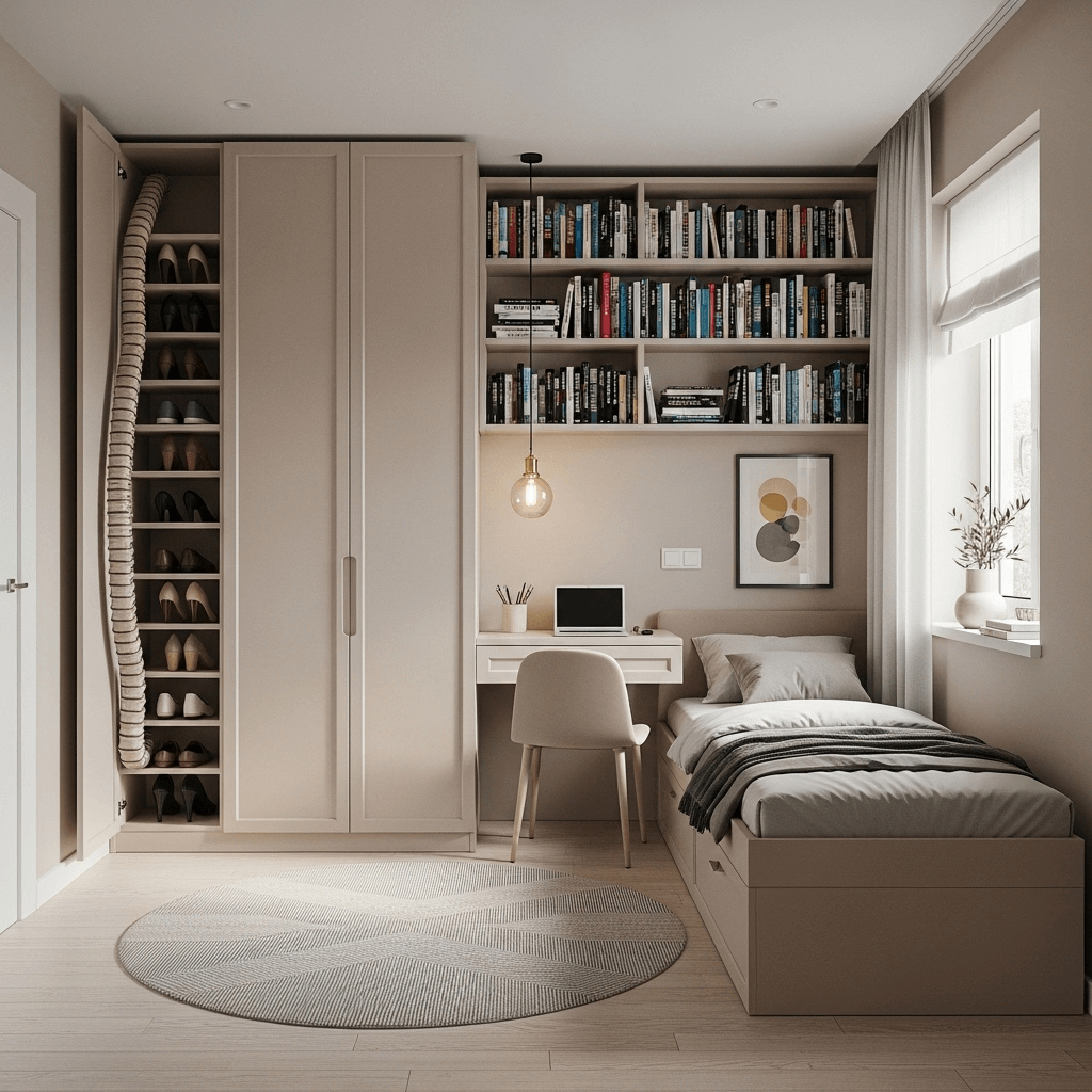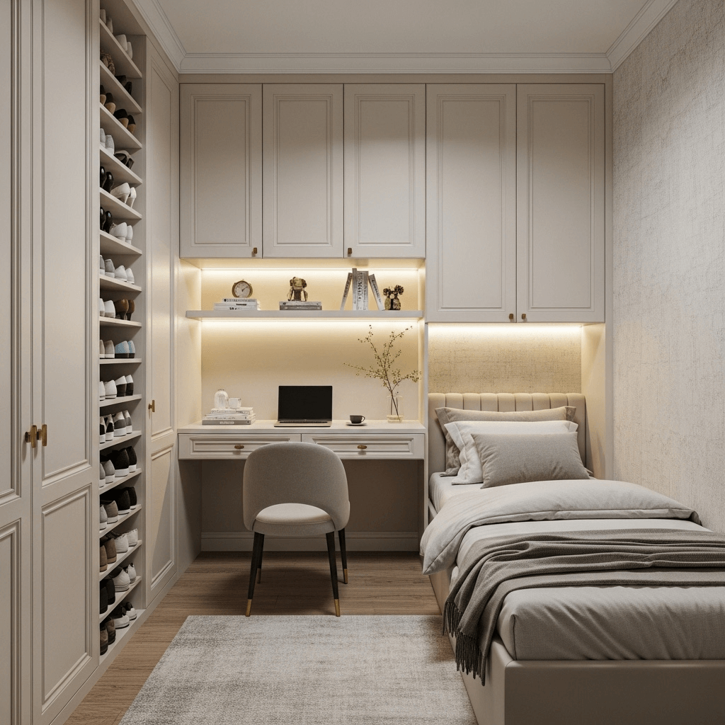 Floor-to-ceiling cabinetry adds serious storage power. On one side, a tall wardrobe hides a vertical shoe rack, an ideal solution for small bedrooms where every inch matters. Above the desk, full-length bookshelves draw the eye upward, visually expanding the room. Soft neutral tones, warm wood flooring, and gentle lighting keep the space calm and balanced. This layout is perfect for anyone searching for small bedroom desk and storage ideas, space-saving bedroom furniture, or compact bedroom with built-in shelving that feels organised, modern, and comfortable without looking crowded.