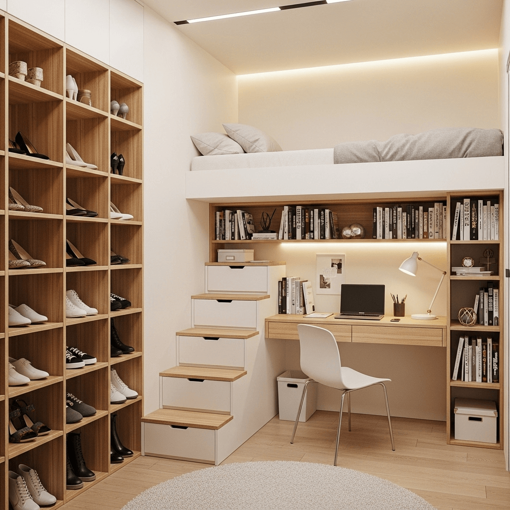 On one side, the floor-to-ceiling shoe cabinet turns storage into a strong design feature. It keeps footwear organised while adding texture through natural wood tones. The integrated steps double as storage drawers, making every element work harder in limited space. Soft neutral colours help the room feel calm and open, even with multiple functions combined. This loft bedroom layout is ideal for apartments, studio rooms, or teen bedrooms where smart planning transforms a small footprint into a comfortable, highly organised living space.