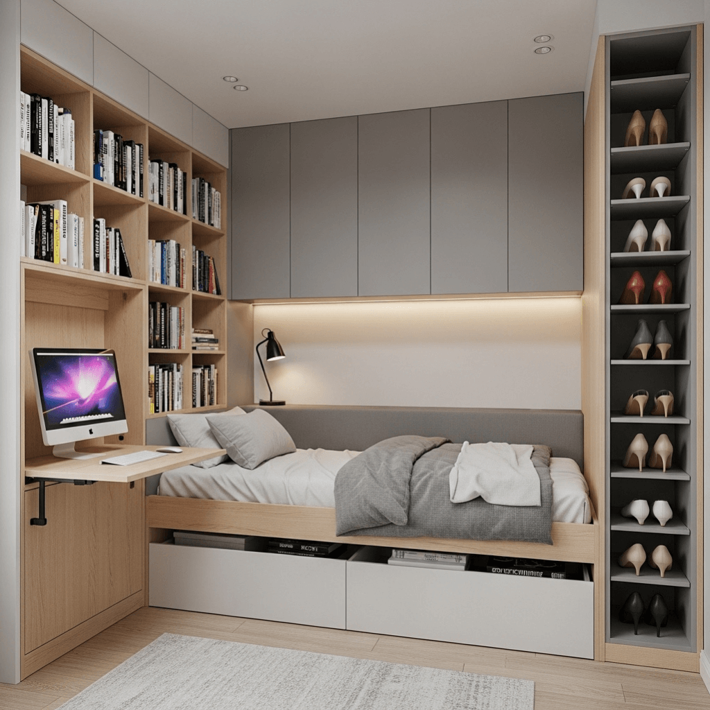 On the left, a compact wall-mounted desk blends seamlessly into the bookcase unit. This integrated study area supports remote work or late-night reading without taking up extra floor space. The tall vertical shoe rack on the right uses height wisely and transforms an unused corner into organised storage. Soft under-cabinet lighting enhances the neutral grey and wood tones, creating a warm and inviting atmosphere. This small bedroom with built-in desk and storage bed offers a balanced mix of style, function, and space-saving design for modern living.