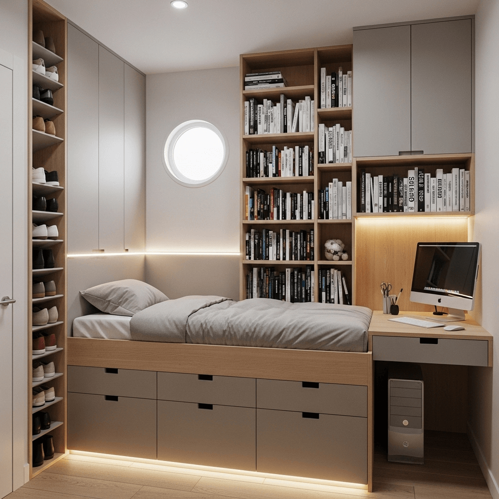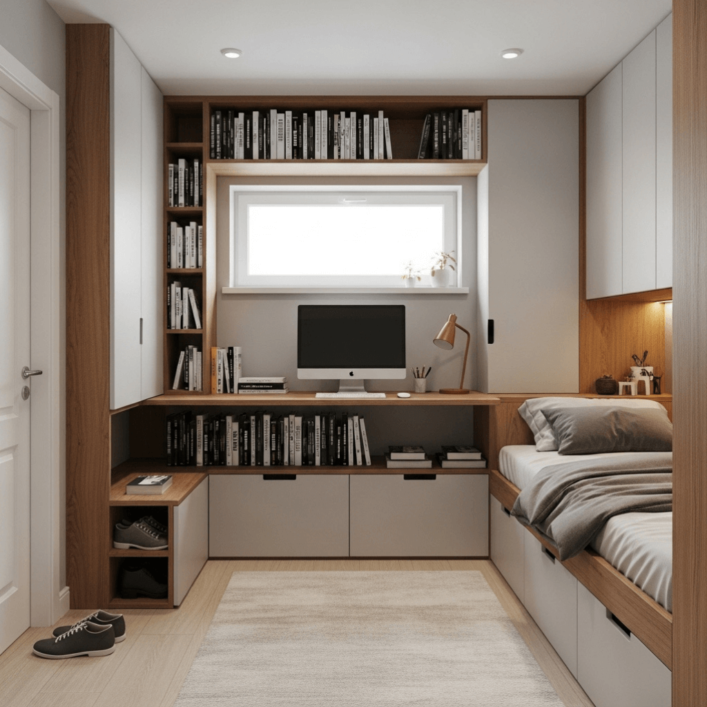 Small Bedroom with Built-In Desk, Wall-to-Wall Bookshelves, and Hidden Shoe Storage
