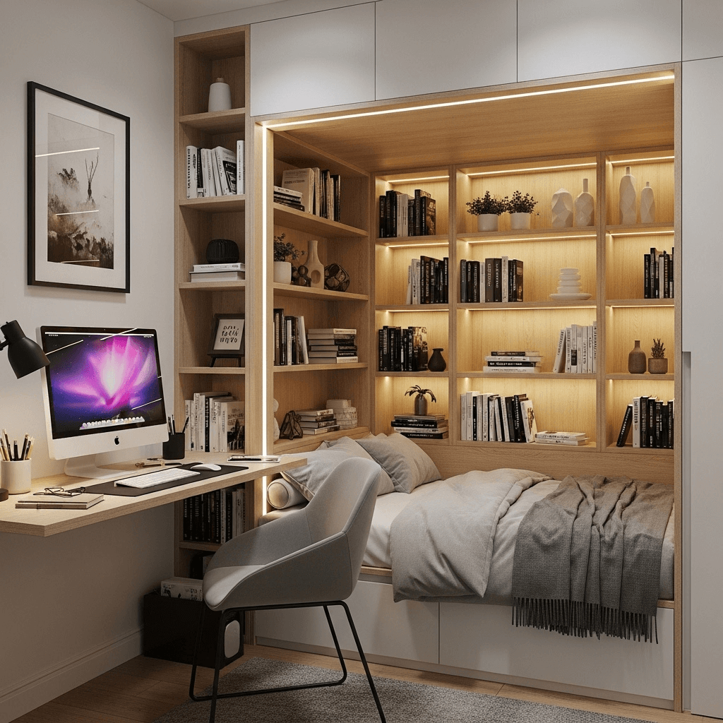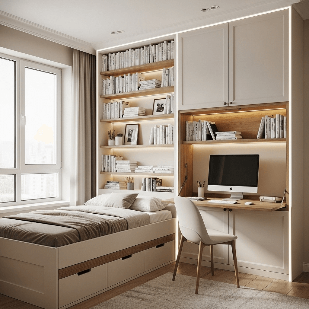 This small bedroom design combines a cosy bed with a built-in bookshelf and a sleek work desk. Warm LED lighting highlights the shelving, while neutral tones keep the space calm. Overall, it offers a smart, stylish solution for modern small bedrooms and home offices.