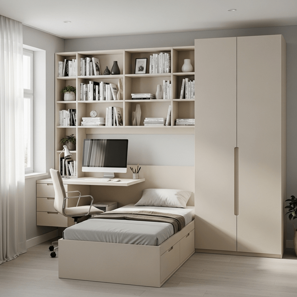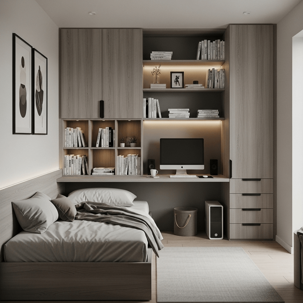 This minimalist bedroom features a built-in wardrobe, overhead bookshelves, and a compact study desk. Soft neutral tones create a calm atmosphere, while under-bed drawers add hidden storage. Overall, the layout maximises vertical space, making it perfect for small bedrooms that need both comfort and functionality.