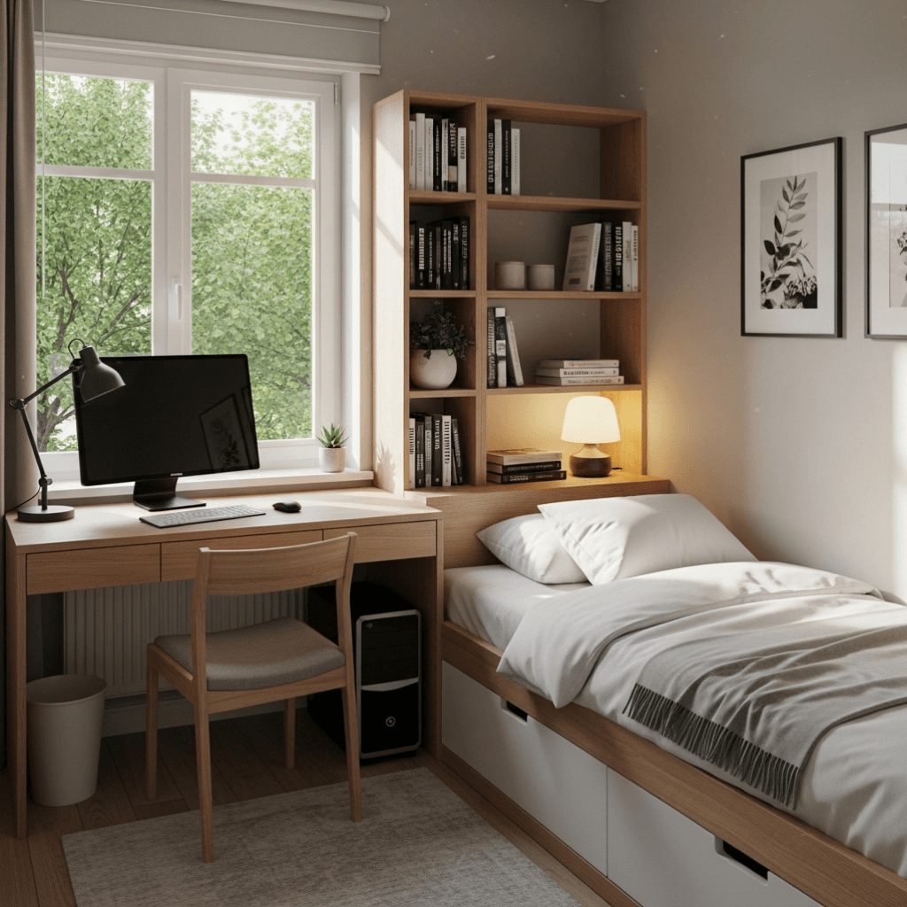This compact bedroom layout blends a cosy single bed with smart under-bed storage and a functional desk placed near the window. The open wooden bookshelf adds vertical organisation, while warm lighting enhances comfort. Overall, it is an ideal solution for small bedrooms, student rooms, or modern apartments.