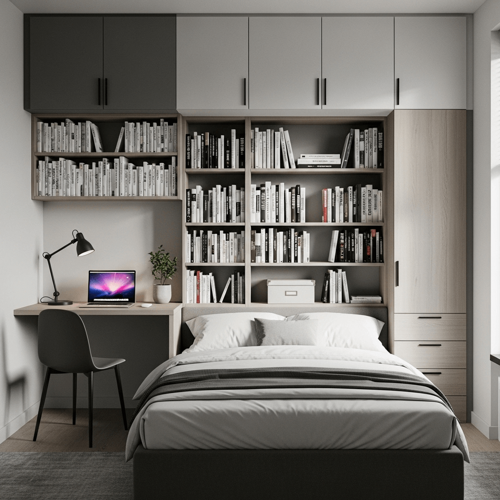 This small bedroom uses floor-to-ceiling bookshelves to maximise vertical space. A built-in desk fits neatly beside the bed, creating a practical study area. Meanwhile, under-bed drawers add hidden storage. Overall, the warm wood tones and soft lighting make the room feel organised, functional, and inviting.