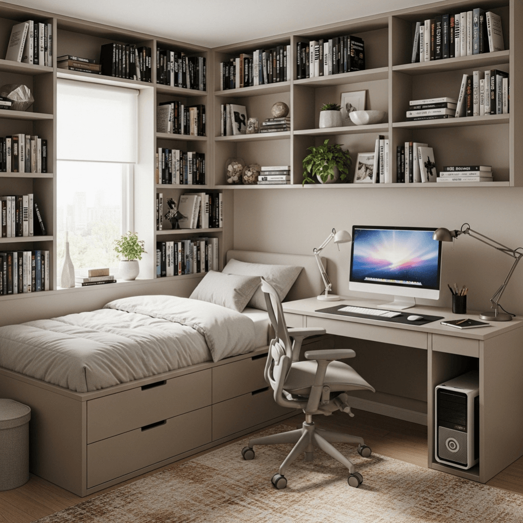 Smart Small Bedroom with Built-In Desk and Library Storage
