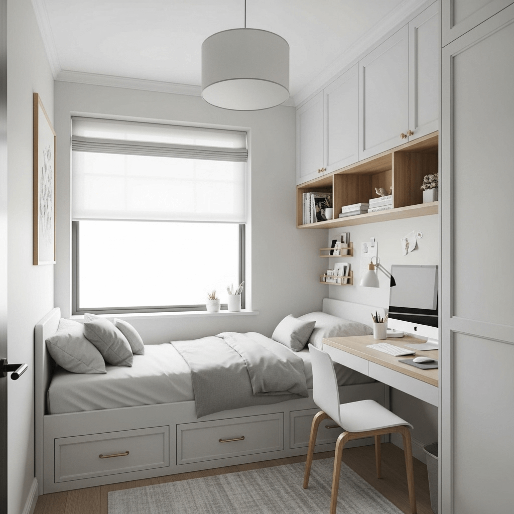 Small Bedroom With Built-In Desk and Storage Bed for Compact Living