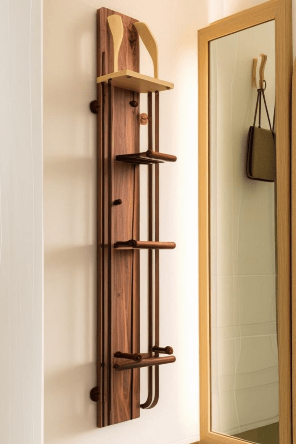 A small entryway wall mounted coat rack with shelf is one of the smartest ways to keep your home organized without taking up floor space. This design combines functionality and style, offering hooks for hanging bags and coats while providing a top shelf for decor or essentials. Perfect for apartments and compact homes, this type of storage helps reduce clutter instantly. The natural wood finish adds warmth and blends seamlessly with modern, minimalist, or Scandinavian interiors, making your entryway feel both practical and inviting.