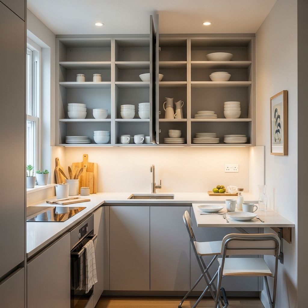 Small kitchens in apartments can feel cramped, but smart design solves the problem. Use vertical storage with hanging racks and magnetic knife strips. Compact appliances save counter space, while multi-purpose items reduce clutter. Light-coloured cabinets and reflective surfaces make the kitchen appear larger. Adding a small island or fold-able table can provide extra workspace. Organise pantry items in clear containers and label them for convenience. Under-cabinet lighting brightens workspace and adds ambience. These compact apartment kitchen makeover tips help create a functional, stylish, and efficient kitchen that maximizes every inch without overwhelming the space.