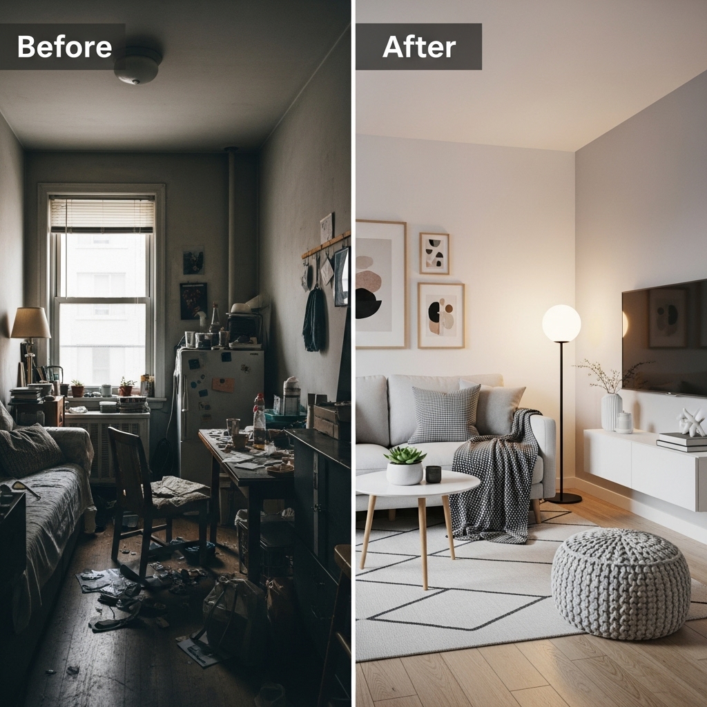 Before-and-after apartment makeovers are inspiring and practical for planning your own space. Start by decluttering and removing unnecessary items. Update walls with paint, wallpaper, or removable decals. Rearrange furniture to maximise flow and define functional zones. Add stylish, multi-purpose furniture and personal touches like art, rugs, and plants. Use lighting creatively to enhance the ambience. Document the transformation with photos to show the dramatic improvement. These apartment makeover before and after ideas motivate small-space dwellers to create functional, stylish, and cozy homes while visualising the impact of simple, smart design changes.