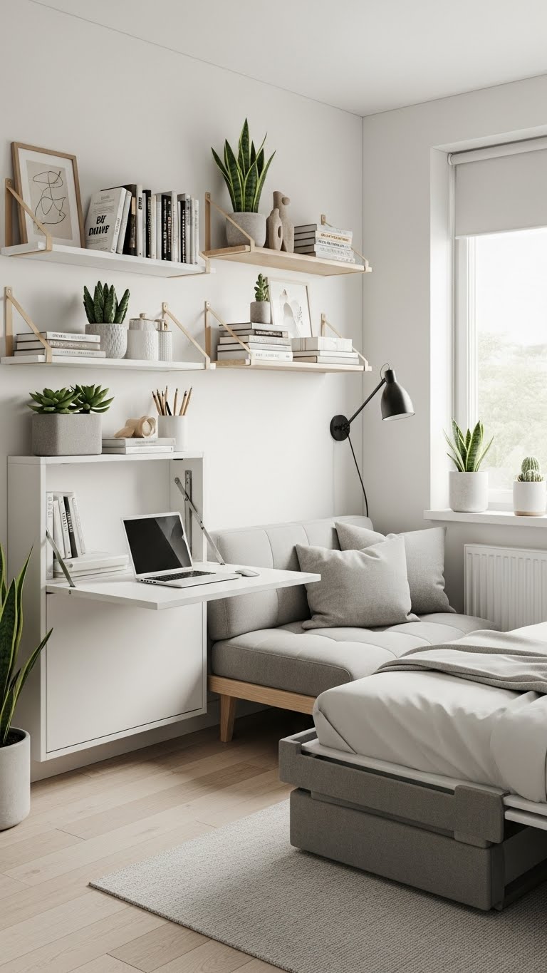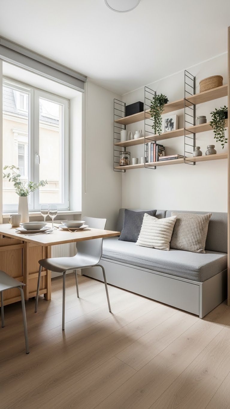 Minimalist decor is perfect for small apartments, making them feel spacious and organised. Choose a neutral colour palette with whites, grays, and soft pastels. Opt for multi-functional furniture, such as sofa beds, storage ottomans, and fold-able tables. Limit decorative items to a few statement pieces rather than cluttering surfaces. Use mirrors to visually expand rooms and natural light to enhance openness. Plants add warmth and life without overcrowding. Wall-mounted shelves save floor space while displaying essentials. These minimalist decor ideas create a clean, airy, and functional small apartment that is both modern and cozy.