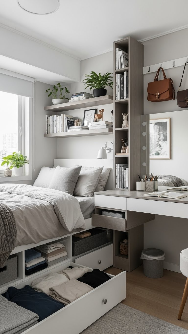 Organizing a tiny apartment is all about smart storage solutions. Use under-bed bins, wall-mounted shelves, and over-the-door hooks to save space. Stack-able containers and baskets help keep items tidy. Multi-purpose furniture, like storage ottomans or fold-able tables, maximizes utility. Declutter regularly and categorise belongings to maintain order. Vertical storage keeps floors clear, while labels ensure easy access. Small decorative boxes can store miscellaneous items without ruining aesthetics. These tiny apartment organisation and storage hacks help maintain a clean, functional, and stylish home, making everyday living more efficient and enjoyable.