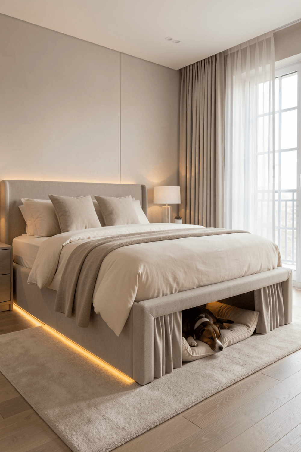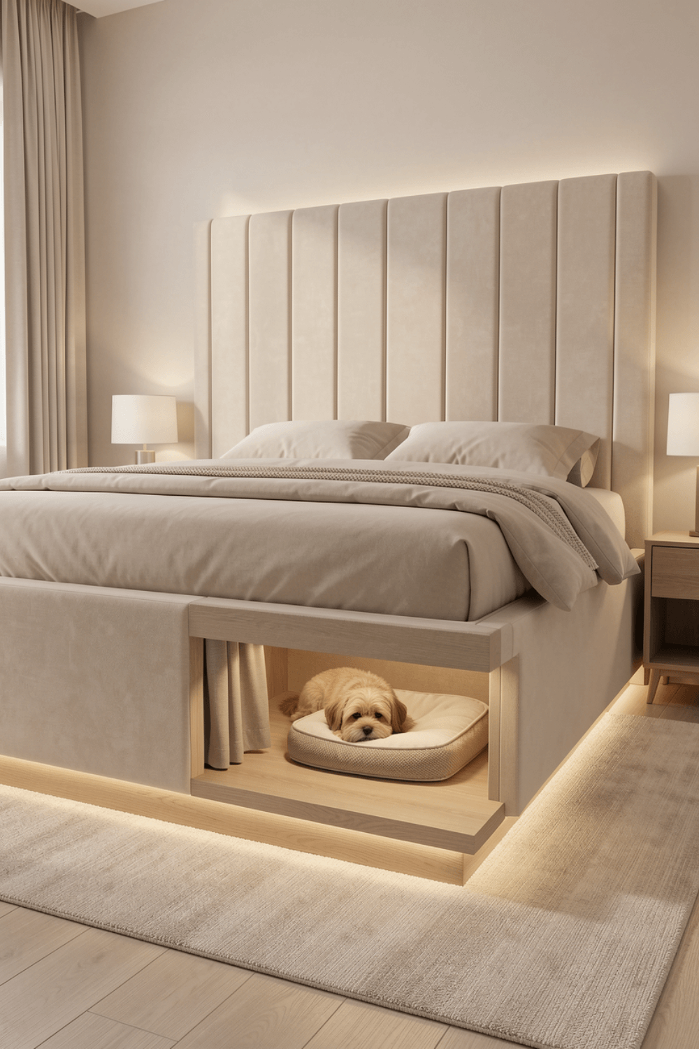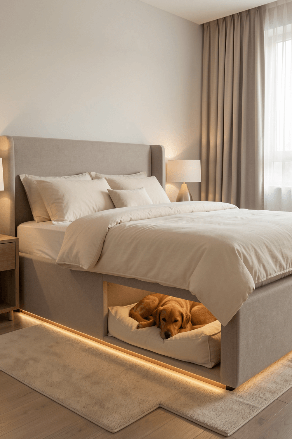 Modern home design is increasingly focused on combining comfort, functionality, and thoughtful details that improve everyday living. This bed with built-in dog bed is a perfect example of how contemporary interiors are evolving to accommodate pets without compromising style. Designed with clean lines, soft neutral tones, and integrated lighting, this bedroom layout feels calm and elegant while offering a dedicated resting space for a dog directly beneath the main bed.