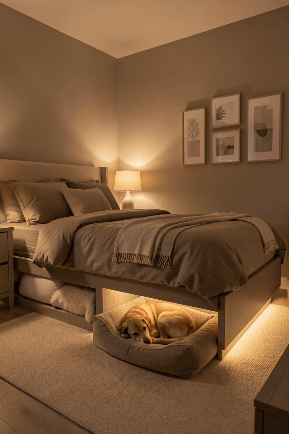 Soft bedding, gentle lighting, and warm tones make the room feel inviting. Including pets in the bedroom design strengthens the sense of home without compromising comfort or style. Cozy pet-inclusive interiors like this balance practicality with emotional comfort.