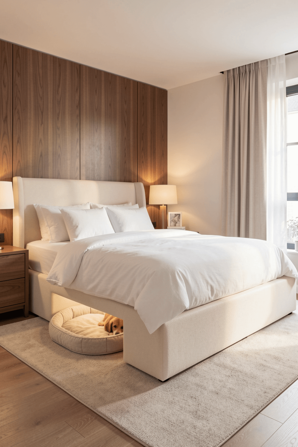 Luxury bedroom ideas are evolving to include pets as part of the design. This bedroom blends elegance with practicality by incorporating a dedicated dog bed beneath the main sleeping area. The result feels upscale yet welcoming.