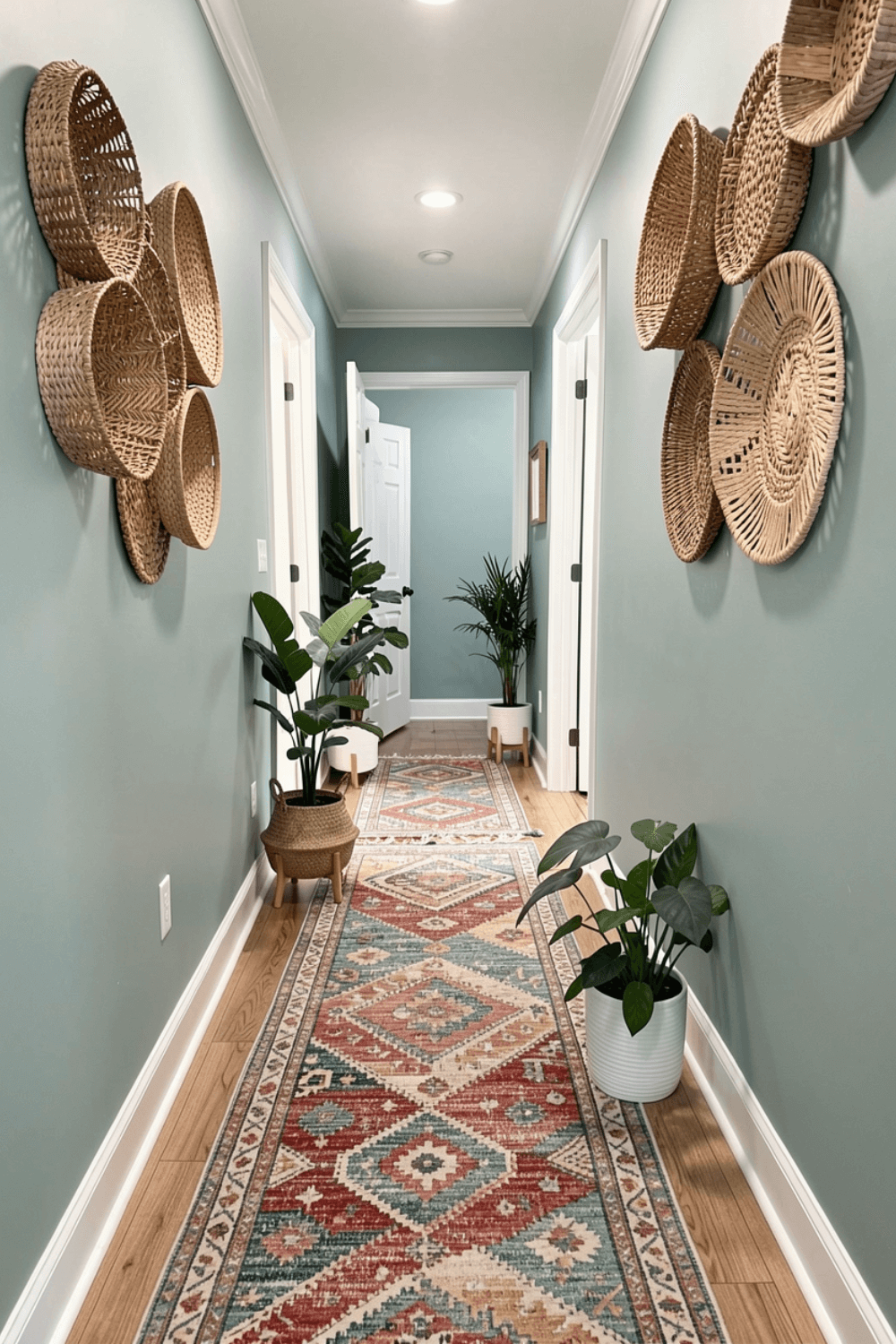 Wall-mounted woven baskets serve as lightweight decor that doesn’t intrude into walking space. Combined with plants and artwork, they create a layered look that feels intentional. Boho hallway decor is ideal for narrow layouts because it relies on texture and vertical elements rather than bulky furniture.
