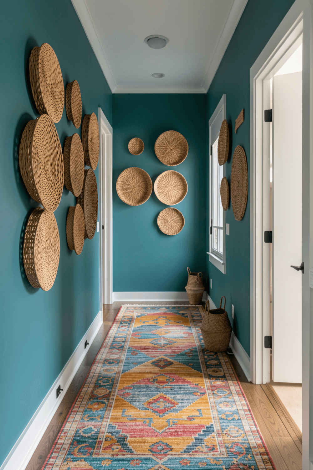 Teal accent walls are a bold yet calming choice for boho hallway decor. The rich colour creates depth and makes artwork and woven textures stand out. In this hallway, teal serves as a backdrop that enhances natural materials like rattan and wood.