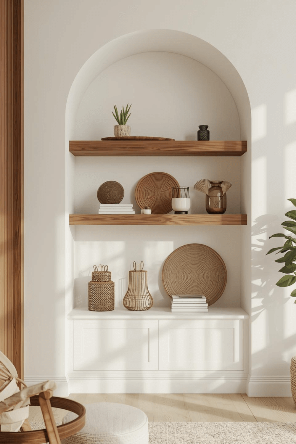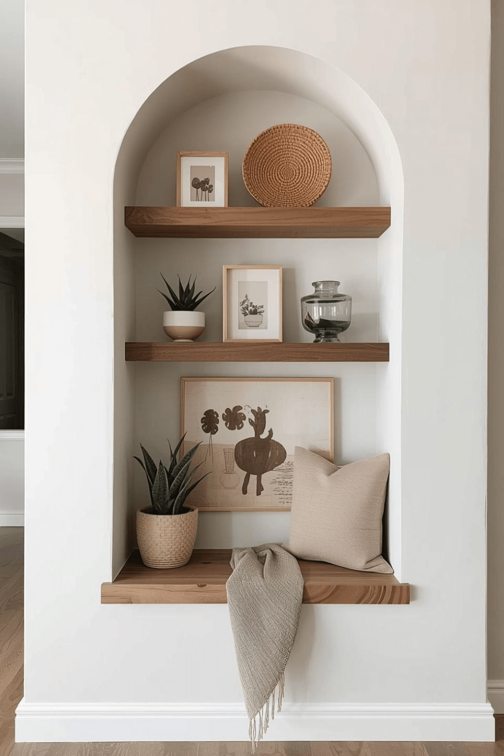 3. Arched Accent Wall Decor Ideas with Wooden Shelves