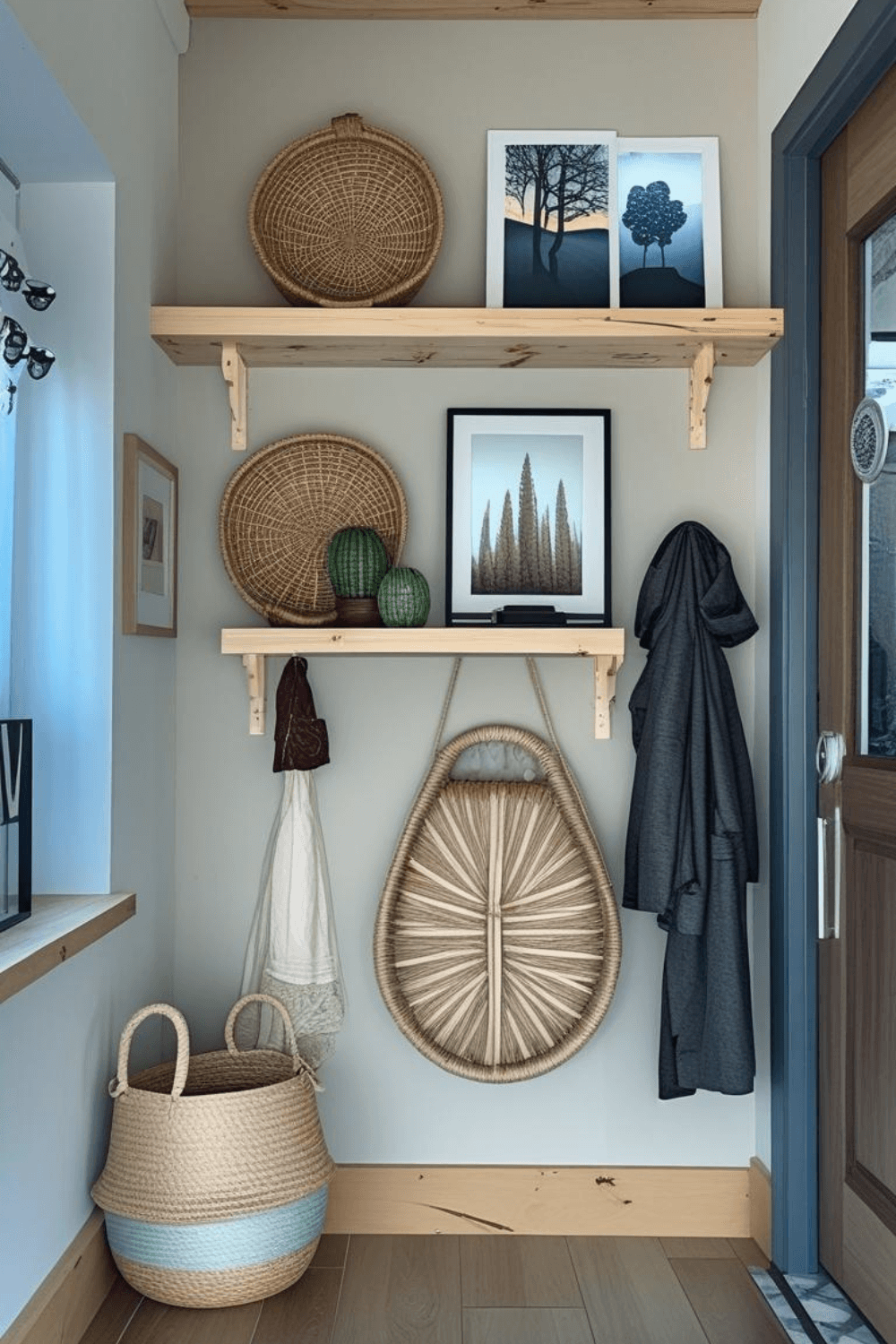 Your entryway is the first impression of your home, and floating shelves are a great way to decorate it. Add small framed prints, plants, and candles to create a welcoming atmosphere. Natural wood shelves paired with earthy decor give a cozy modern feel. Entryway wall styling is perfect for small spaces where you want decor without bulky furniture. This simple design idea makes your home look organized, stylish, and inviting from the moment you walk in.