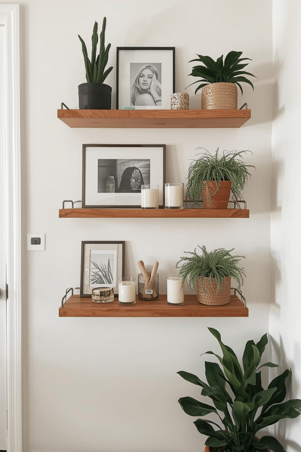 Bohemian wall decor is all about warmth, texture, and cozy details. Floating shelves styled with plants, candles, and woven accessories create a relaxing atmosphere. Natural wood tones combined with earthy decor pieces make the space feel inviting. This style works perfectly in living rooms, bedrooms, or entryways. Adding greenery brings life to the shelves, while candles add soft warmth. Boho shelf decor is an easy way to upgrade any blank wall beautifully.