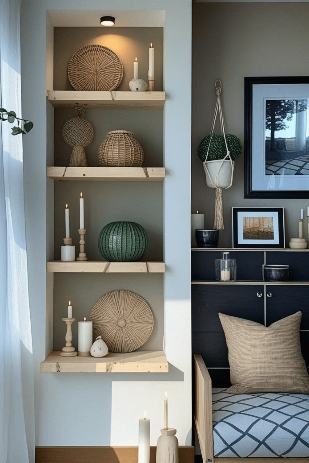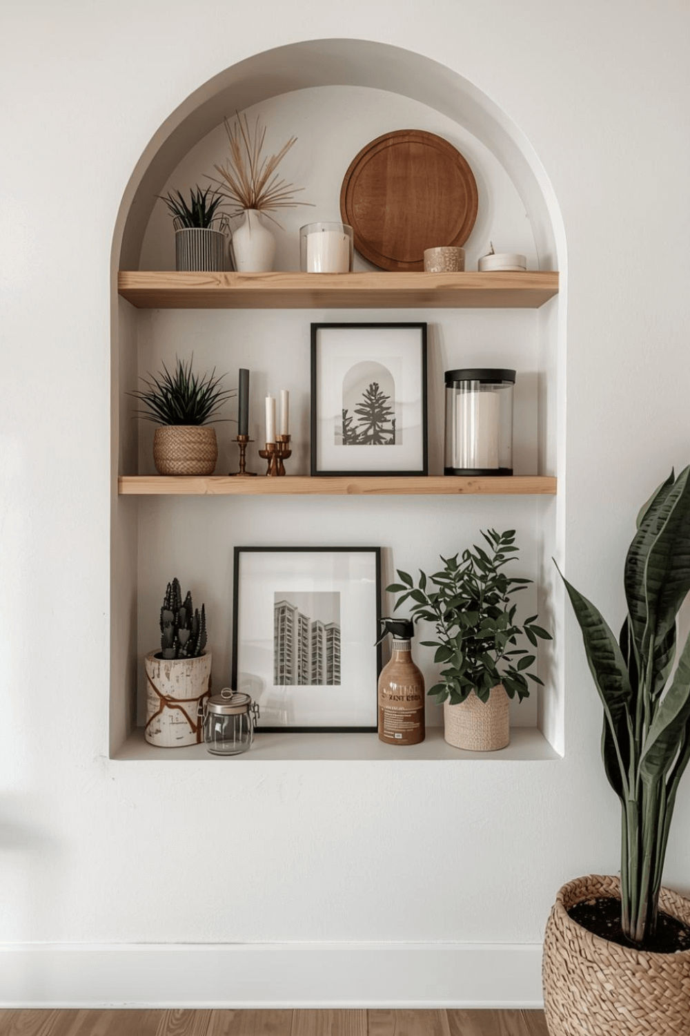 Wall niches are a creative way to decorate unused spaces in your home. Adding floating wooden shelves inside a niche creates a modern and functional display area. Style it with candles, plants, framed art, and natural decor pieces for a cozy look. Neutral tones and soft accent colors make the niche stand out beautifully. These simple niche decorating ideas work well in living rooms, entryways, and hallways, making your home feel more personalized and stylish.