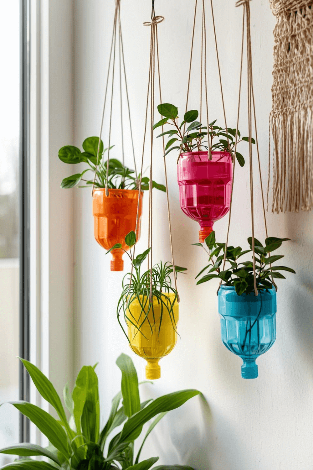 3. How to Make Colourful Hanging Planters from Recycled Bottles