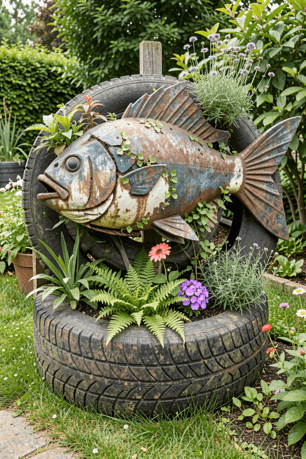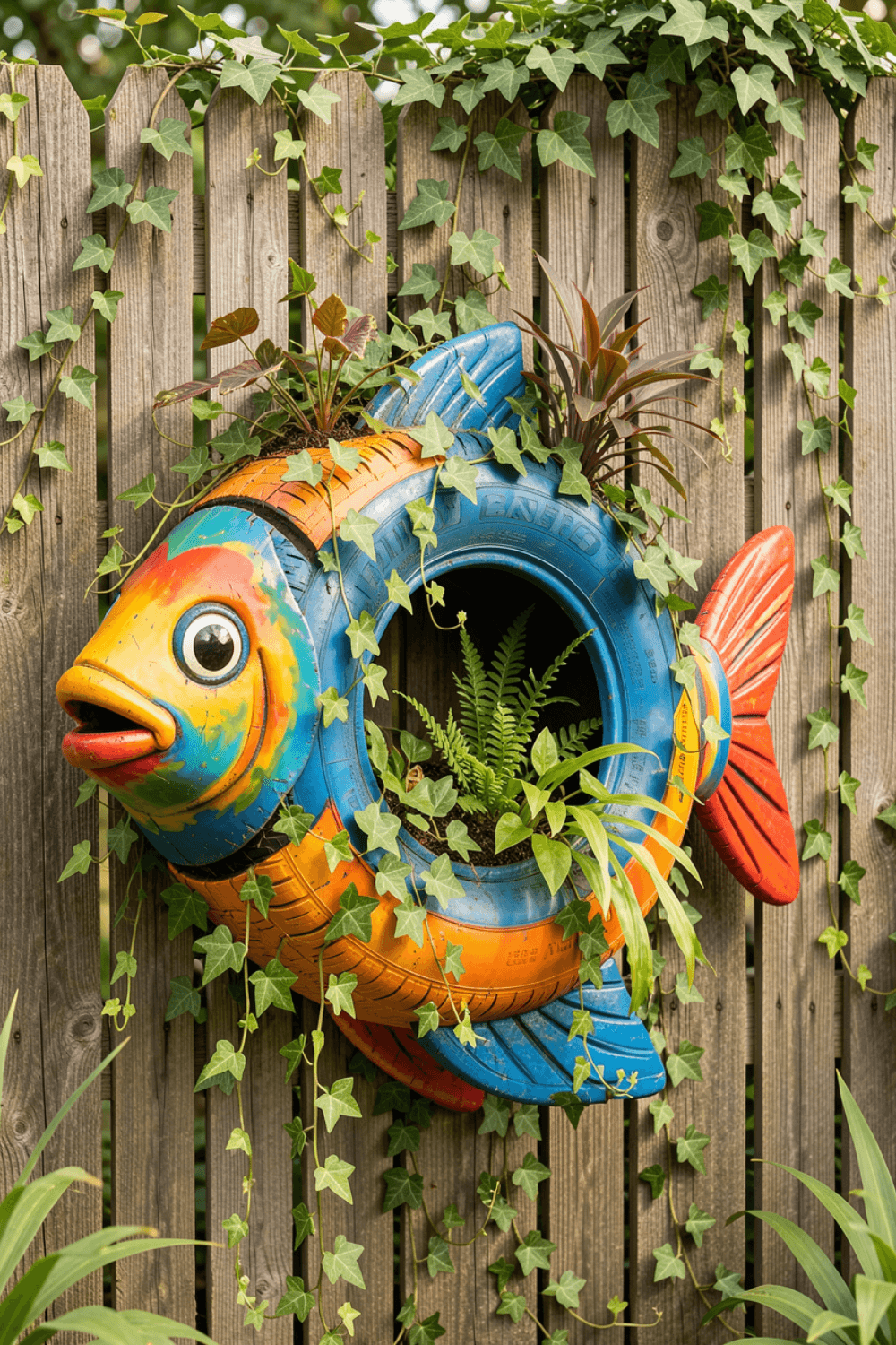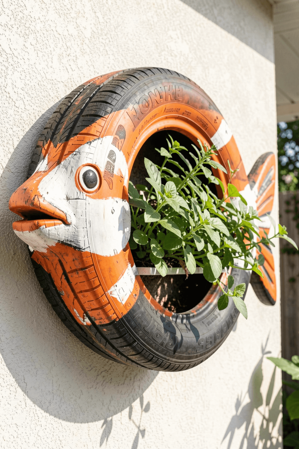 Upcycled tire garden ideas show how everyday waste can be transformed into meaningful decor. A fish-shaped wall planter combines reuse with artistic expression, creating a piece that feels intentional and well-designed.