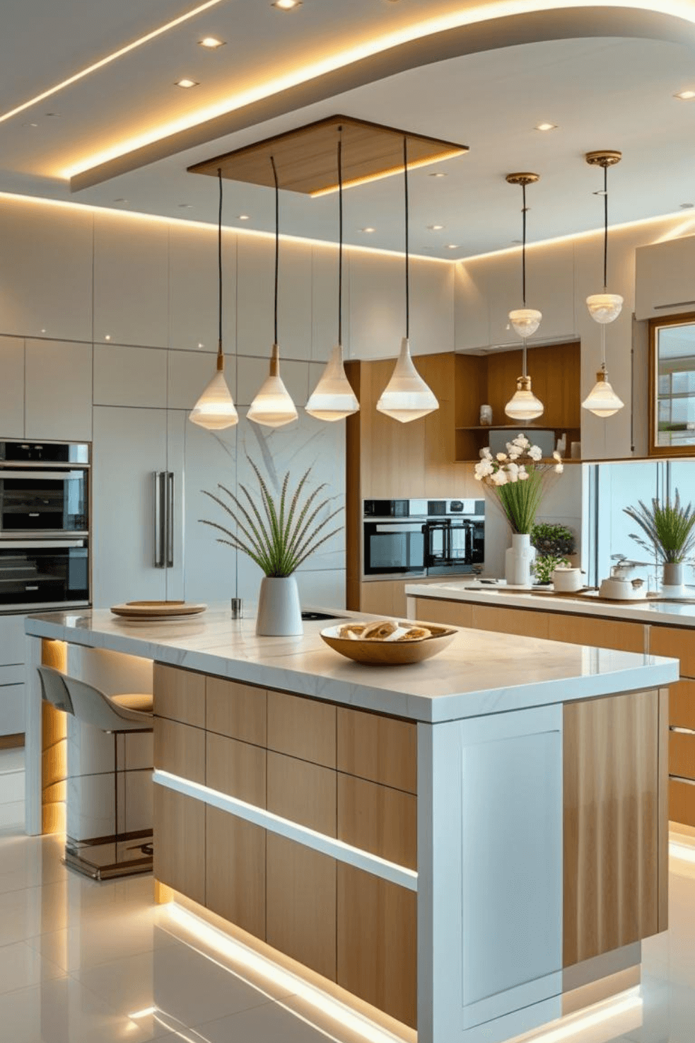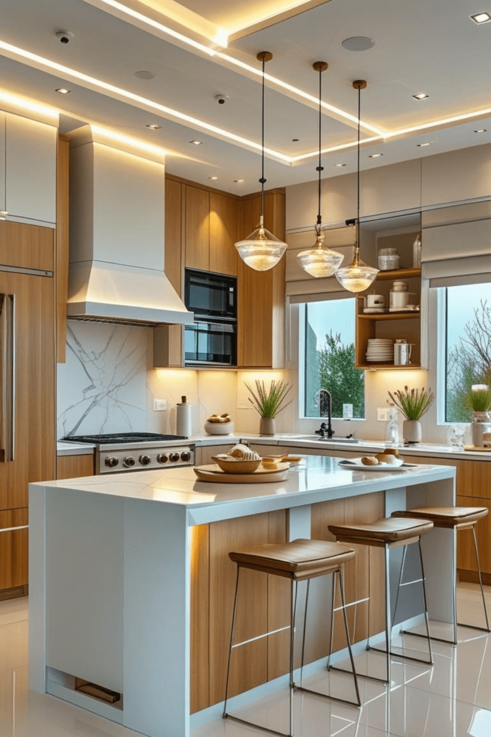 Warm modern kitchen interiors combine luxury with comfort. White surfaces keep the space bright, while wood cabinetry adds natural warmth. LED strip lighting creates a soft glow that enhances the high-end aesthetic. Minimalist design and clean layouts make the kitchen feel spacious and elegant. Adding pendant lights and subtle greenery completes the modern look. These warm modern kitchen ideas are perfect for homeowners seeking a stylish, timeless kitchen that feels both cozy and luxurious.