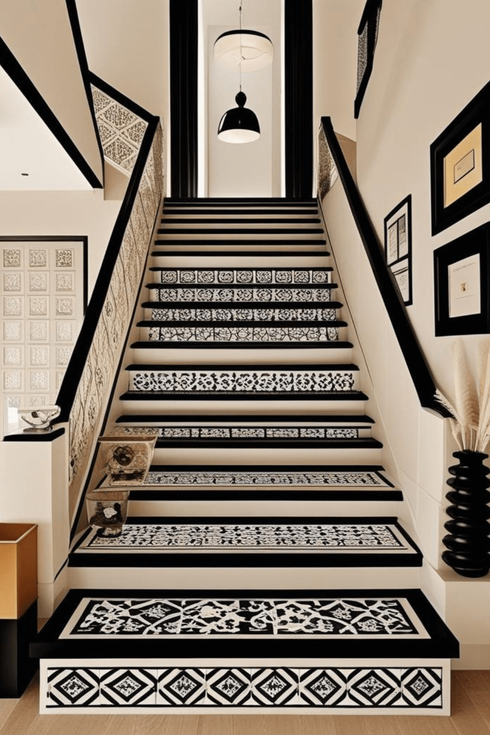 Decorative stair tiles are also a practical choice for homeowners looking for durable and easy-to-maintain flooring. These modern stair tile decor ideas protect the steps from daily wear while enhancing the overall aesthetic of the space. Pairing patterned tiles with neutral walls, sleek railings, and minimal decor creates a timeless interior style. Whether you want a small staircase makeover or a full home upgrade, black and white staircase tiles offer a beautiful and long-lasting design solution.
