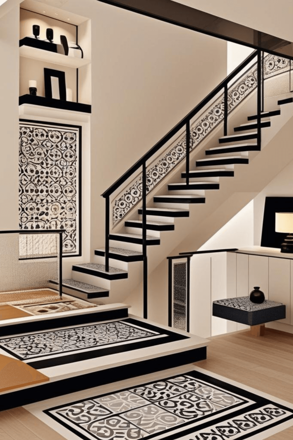 Modern staircase tile design is a beautiful way to upgrade your home interior with a clean and elegant look. Black and white patterned stair tiles create a bold contrast while keeping the space minimalist and sophisticated. These designs work perfectly in modern homes, adding character without clutter. Staircase tile runners are also practical because they protect steps from wear and add visual interest. Pairing geometric tile patterns with neutral walls and simple decor creates a timeless interior style. This staircase design trend is ideal for anyone wanting a modern and high-end home upgrade.