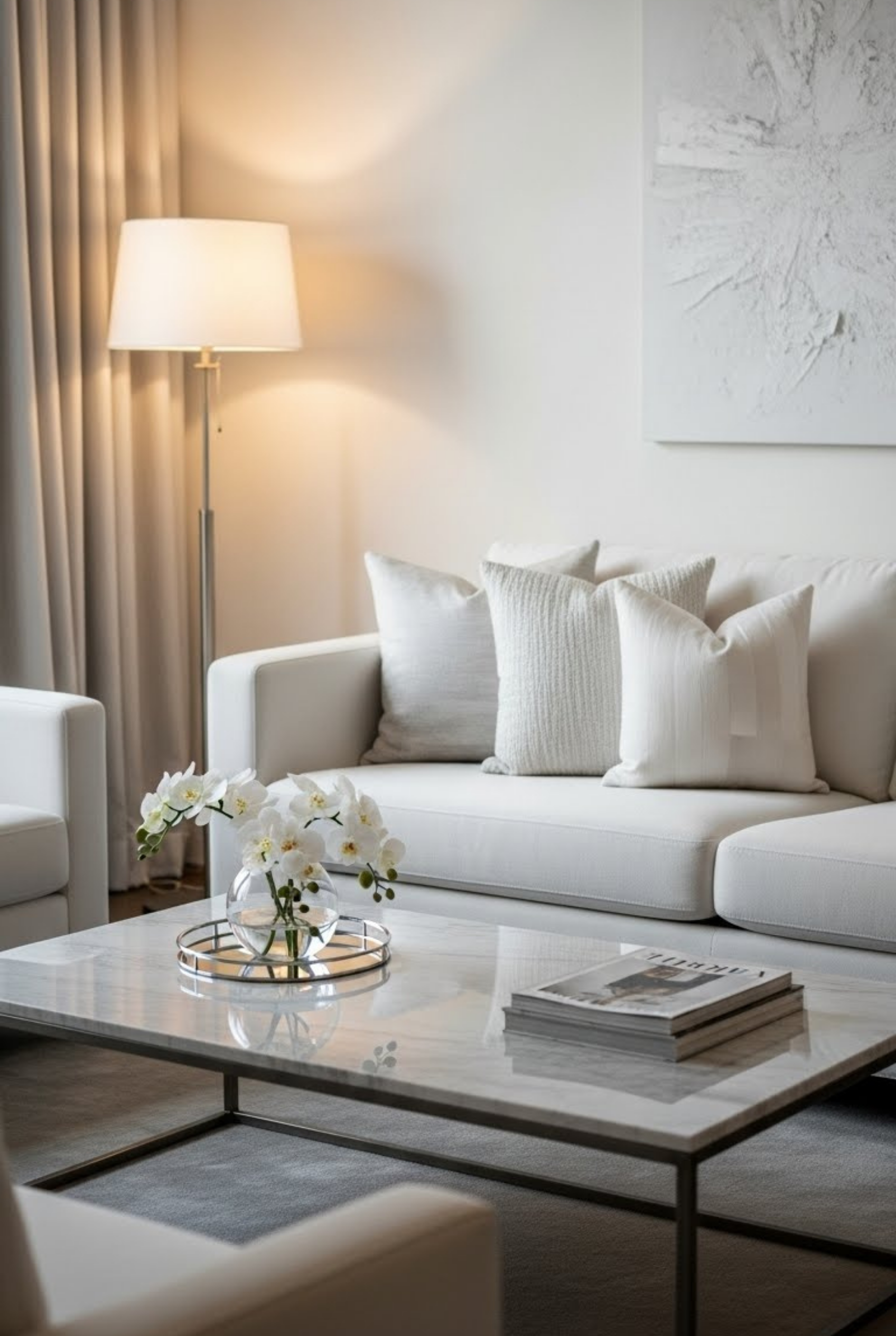 Soft lighting enhances the comfort of a white living room. Floor lamps, table lamps, and warm bulbs create a gentle glow that balances bright white surfaces. This lighting approach adds depth and mood, making the space feel relaxing and welcoming, especially in the evening.