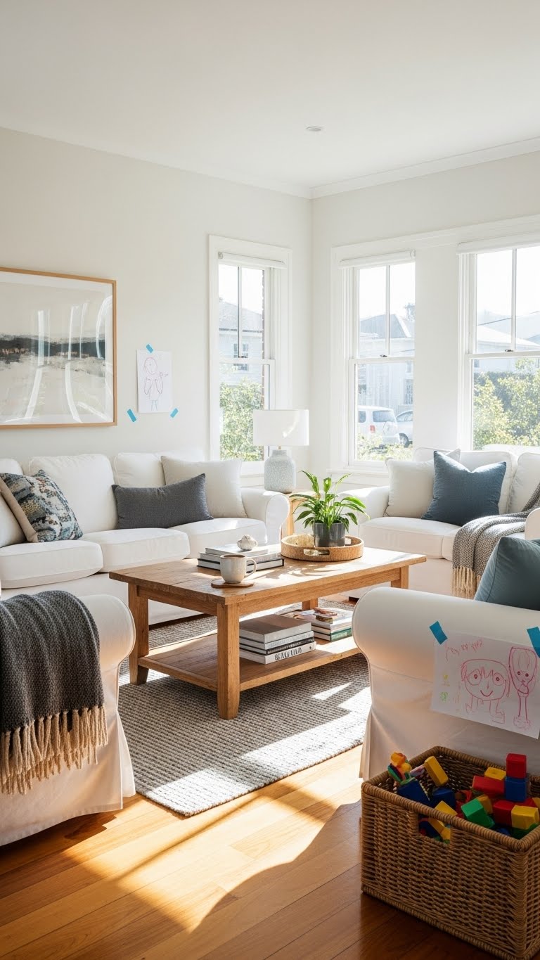 White living rooms in family homes can be both stylish and practical. Durable fabrics, comfortable seating, and easy-to-clean surfaces keep the space functional. White tones brighten the room while thoughtful design choices ensure comfort for everyday family life.