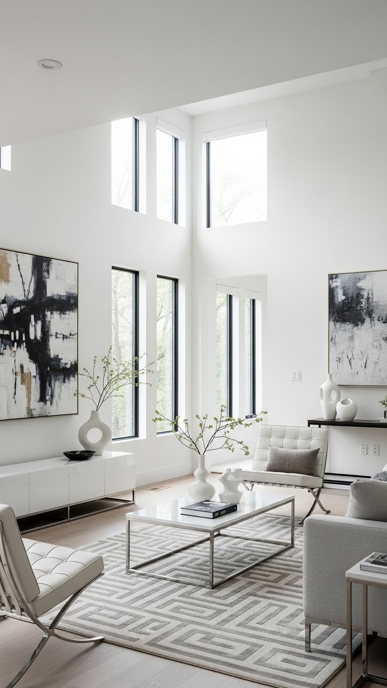 Minimalist white living room decor is about intentional choices. Keep furniture simple, limit accessories, and let negative space breathe. White walls and neutral furniture create calm, while one or two statement pieces add interest. This style works best when clutter is avoided and natural light is emphasized.