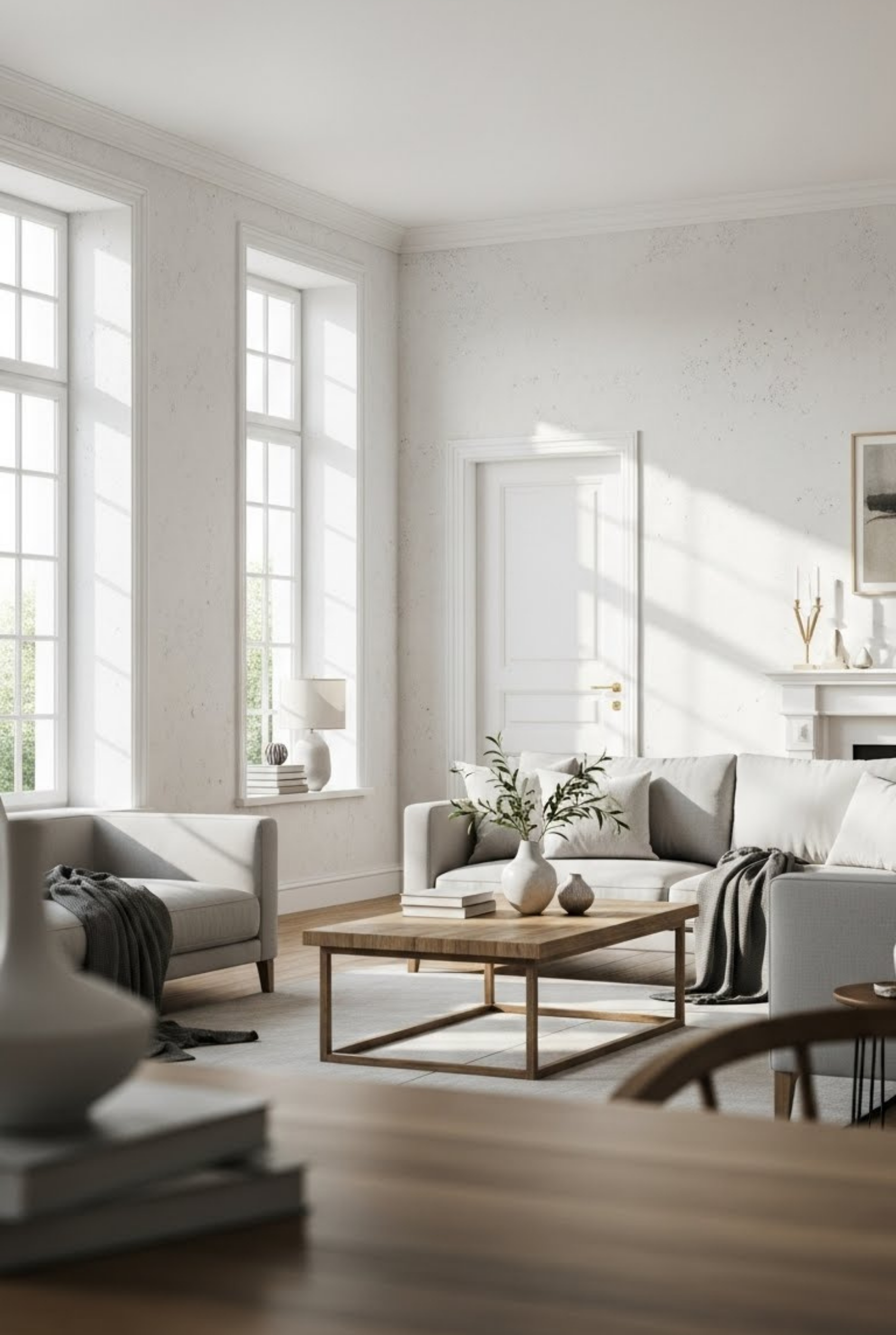 Warm accents soften the crisp look of a white living room. Wooden furniture, beige textiles, and soft lighting create harmony. These elements prevent the room from feeling sterile while preserving its brightness. Warm accents add personality and make white interiors feel more comfortable and welcoming.