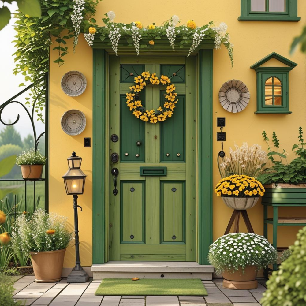 A charming cottage door design can completely change a home’s appearance. The green door paired with yellow walls feels fresh and calming. Flowers around the entrance add softness and natural beauty. This style works perfectly for cozy homes that focus on simplicity, comfort, and traditional exterior aesthetics.